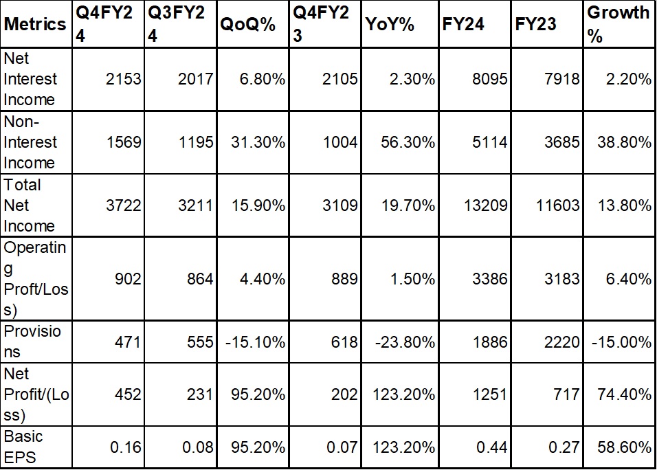 The Net Profit earned by YES BANK for Q4FY24 stood at ₹452 Crs up 123.2% Y-o-Y & 95.2% Q-o-Q. FY24 Net Profit at ₹1,251 Crs up 74.4% Y-o-Y