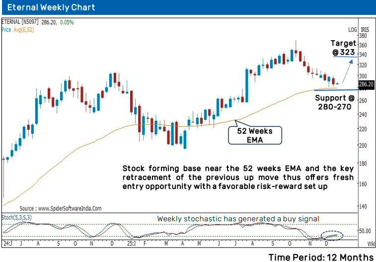 Eternal has been in a corrective phase for the past 2–3 months and is consolidating near the ₹280–₹270 demand zone. This zone aligns with: