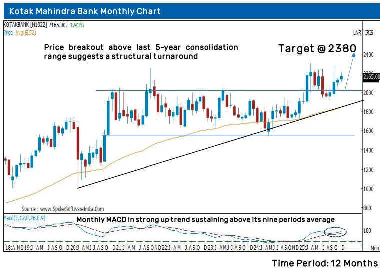 Kotak Mahindra Bank has moved above its five-year consolidation range of ₹1,600–₹2,000. The ₹2,000 level is identified as a support zone.