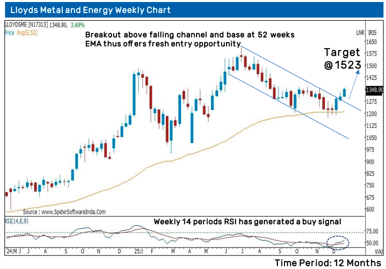 Lloyds Metals and Energy has broken out above a falling channel that had contained prices for the past six months. The stock retraced its seven-week decline from ₹1,361 to ₹1,170 in three weeks.